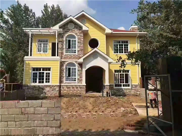 該建筑包括具有內裝飾層中間層外裝飾層的墻體中間層的表面上設置多個凸起的肋條,內裝飾層以及外裝飾層上設置多個與所述肋條配合的卡槽所述肋條能夠與所述卡槽卡合,在所述輕鋼架結構的下方還設置有多個固定結構。該輕鋼結構建筑采用了相互配合的卡合的墻體結構使得整個建筑易于組裝該輕鋼結構建筑在下方設置有固定結構,使得該建筑適合建造成多層。